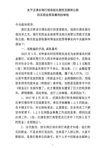 1吉林汪清农商行被举报涉嫌违规套取公款购股牟利 借改革之名侵吞股东权益阅读 (1061)
