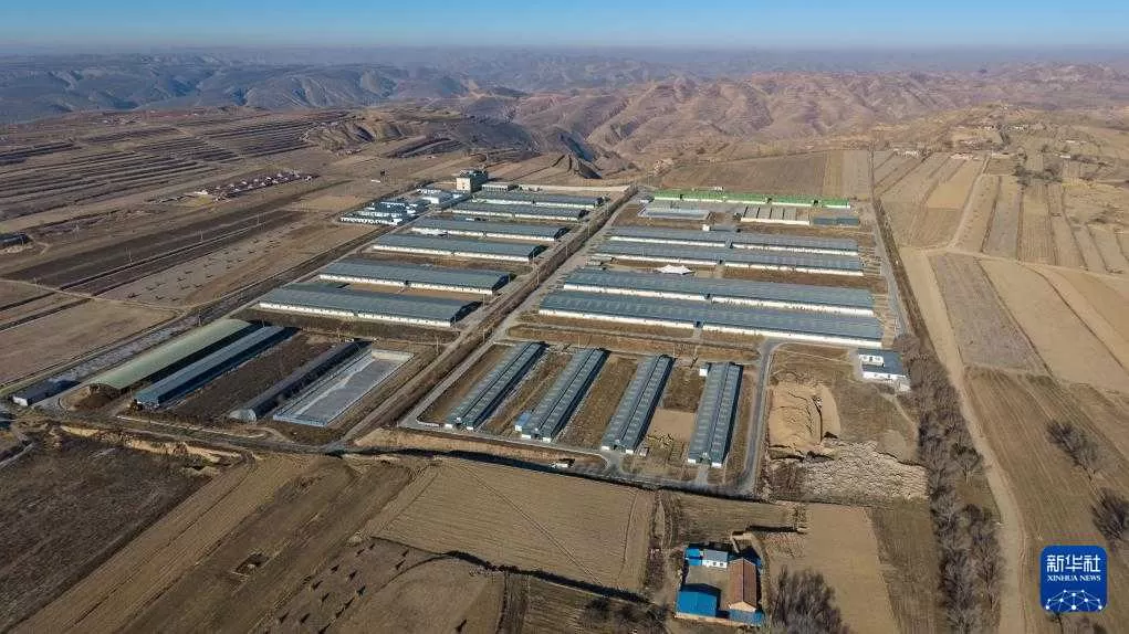 这是1月8日在庆阳市环县山城乡八里铺村拍摄的肉羊育种基地(无人机照片)。 地处陇东黄土高原的甘肃省庆阳市环县是传统养羊大县。近年来,环县携手中国农业科学院