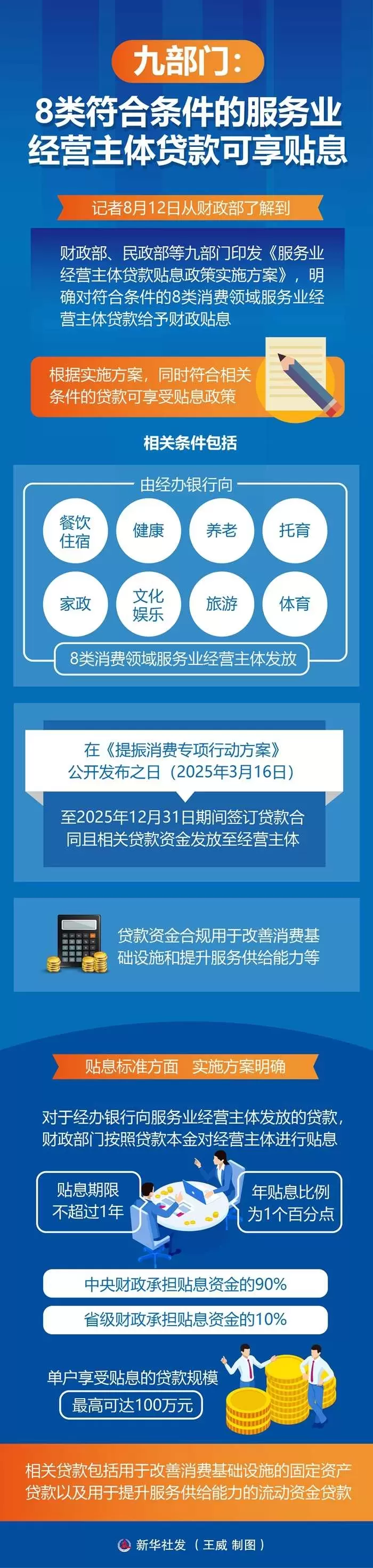 新华社北京8月12日电(记者申铖)记者12日从财政部了解到,财政部、民政部等九部门印发《服务业经营主体贷款贴息政策实施方案》,明确对符合条件的8类消费领域服务业