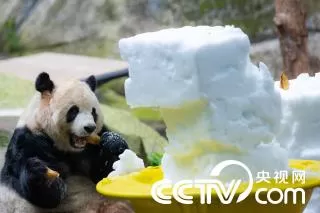 重庆动物园大熊猫玩雪爬树享用“冰糕大餐”
